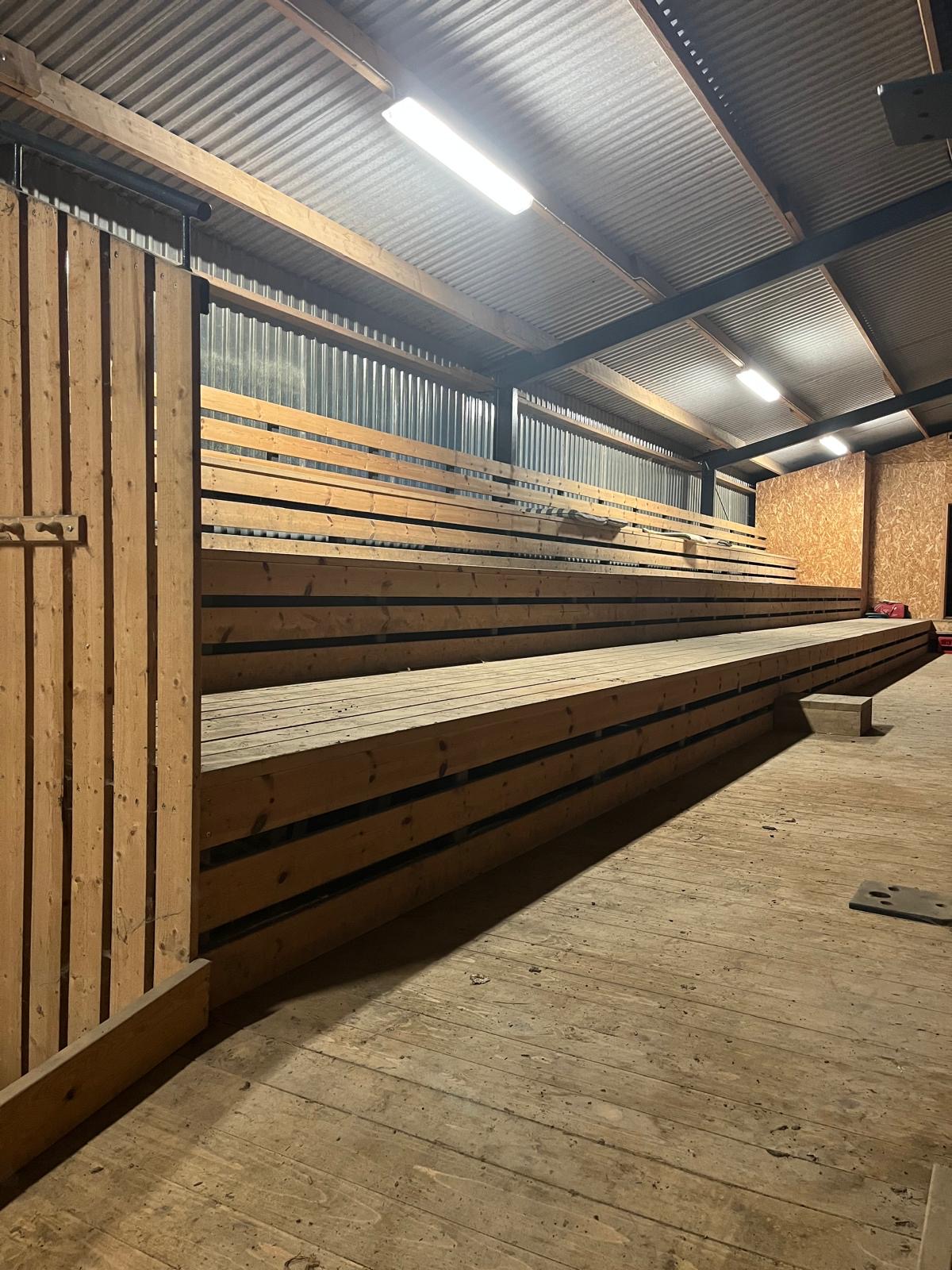 Ridhuset byggdes 2012, måtten är 22x48m med MacHippo hopp underlag. 2014 byggdes ridhuset ut med en läktare och domartorn. Läktaren har plats för ca. 150 personer. Vi har en stor hinderpark med material för såväl utomhus som inomhusbruk.
