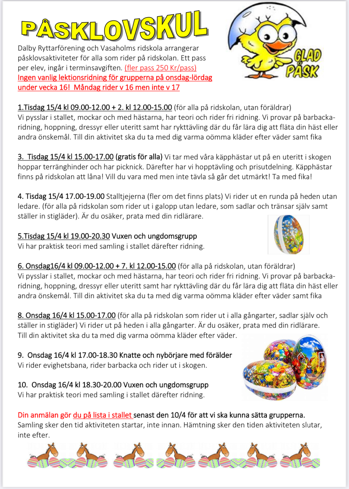 Nu är det dags för påsklovsaktiviteter på ridskolan. Information finner du här samt i stallet. Anmälan på lista i stallet, hoppas vi ses och får roliga dagar tillsammans i stallet!