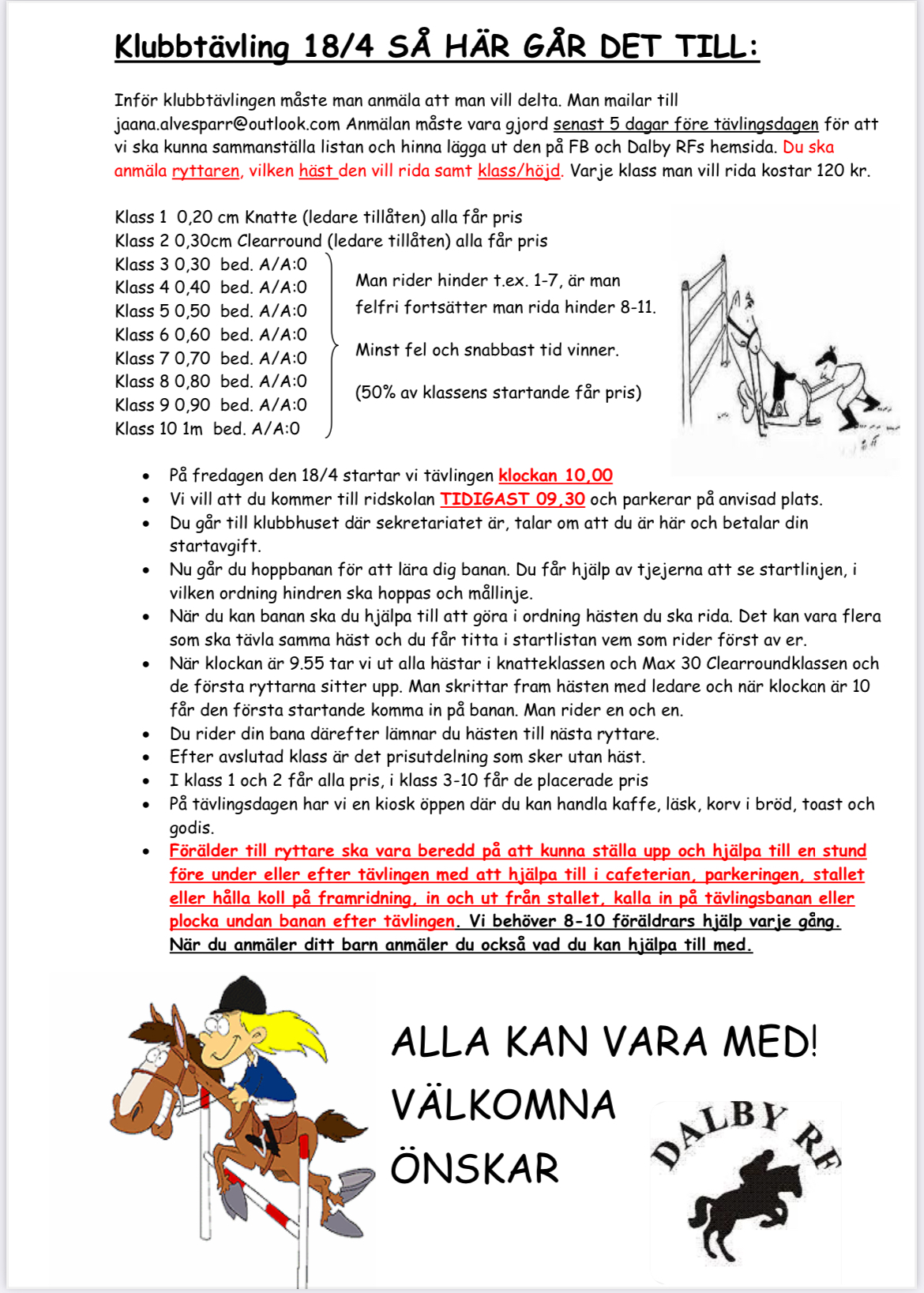 Nästa klubbtävling planeras till den 18de maj. Planera redan nu in det i kalendern. Inbjudan kommer. Tycker ni sommarlovet blir för långt utan hästar? Vi planerar som vanligt för ridläger v. 32, mer information kommer.